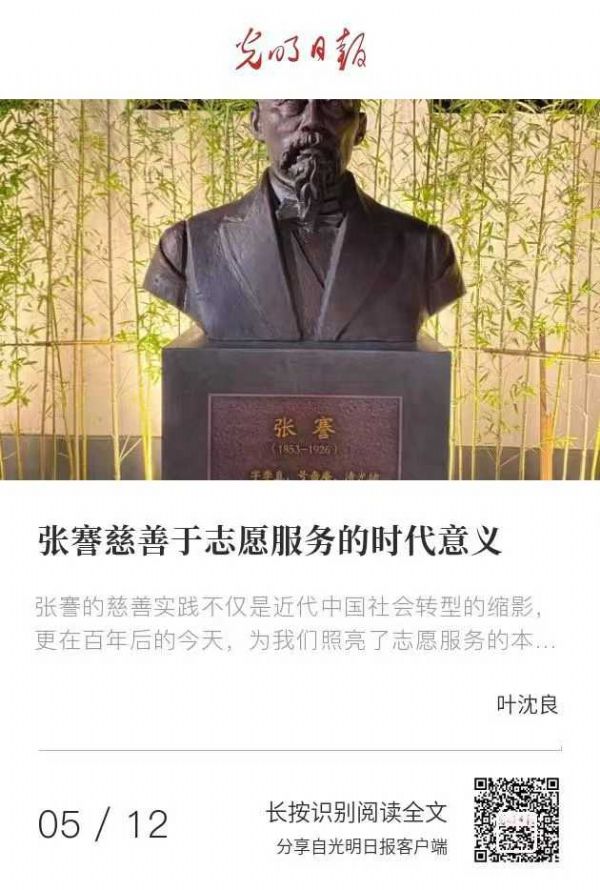 站在张謇先生的墓前,看濠河水静静流淌,岸边的养老院里传来老人们的笑声,更俗剧院的钟声准时敲响。百年前的那个身影,早已化作一种精神符号,在岁月中愈发清晰:他告诉我们,慈善不是富人的专利,而是每个公民的责任;志愿服务不是一时的热情,而是一生的坚守。当我们将张謇的慈善理念化作行动指南,便是对他精神最好的传承。在这个价值多元的时代,让我们以他的"有用事业"为镜,在志愿服务中书写属于自己的生命篇章,让每个灵魂都因奉献而不再"与草木同腐"。(作者:叶沈良 )