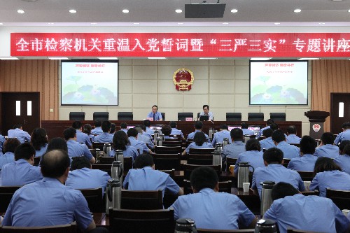 会上,市检察院党组成员、检察长助理、机关党委书记季程带领全体干警面向党旗,庄严重温入党誓词。叶沈良从“正身崇德的人身修养——严修身、勉善弃恶的人生信念——严用权、激浊扬清的人格魅力——严律己、弘文习史的人文理念——谋事实、亲仁善邻的人际交往——创业实、本固邦宁的人民情怀——做人实”等六个方面为大家全面解读了习近平总书记的严实精神,让全市检察干警进一步深入领会了习总书记系列讲话精神,为大家深刻理解“三严三实”专题教育提供了丰富生动的教材。