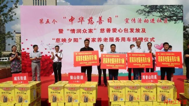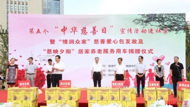 9月1日上午,第五个“中华慈善日”宣传活动进社区暨“情润众家”慈善爱心包发放及“慈映夕阳”居家养老服务用车捐赠仪式在中华慈善博物馆广场举行市政协主席、市慈善总会会长黄巍东、市慈善总会副会长顾诺之、市民政局党组书记、局长,市慈善总会常务副会长汤雄、市慈善总会副会长叶沈良、市民政局党组成员、副局长,市慈善总会副会长兼秘书长沈华、崇川区副区长周卫平、崇川区慈善会会长时国华、崇川区民政局局长张建国、开发区党工委组织部副部长陈蕾等出席仪式。